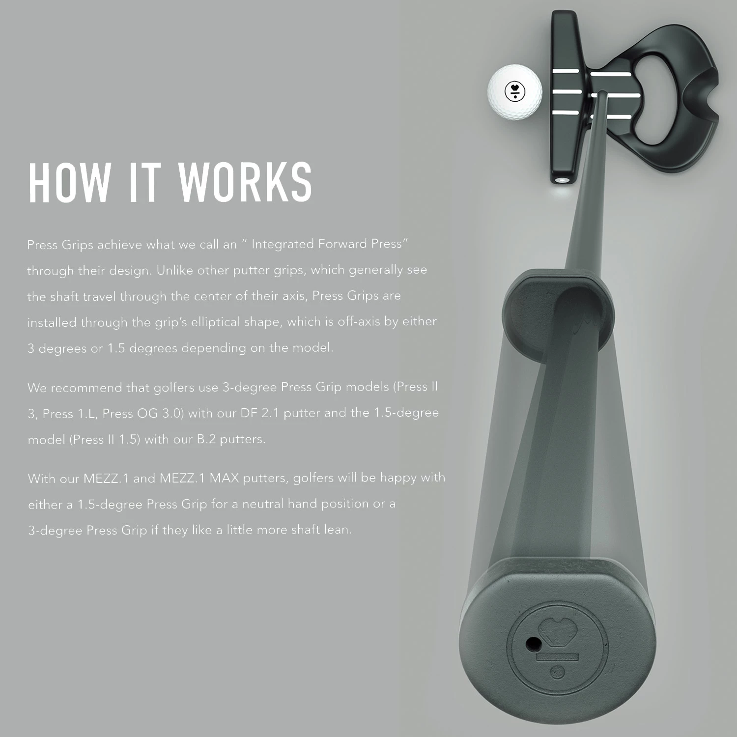 All our L.A.B. Golf putters have the superb Forward Press grip installed on them, which further enhances the qualities of these superb putters. Press Grips are created with built-in Forward Press Technology. It allows golfers to keep their hands vertical at address, allowing the angle of the grip to pre-set the ideal shaft lean. This makes it instinctive for golfers to hit up through impact and create a pure end-over-end roll and after extensive testing, the best results were seen when this grip was paired with the L.A.B. Golf putters.