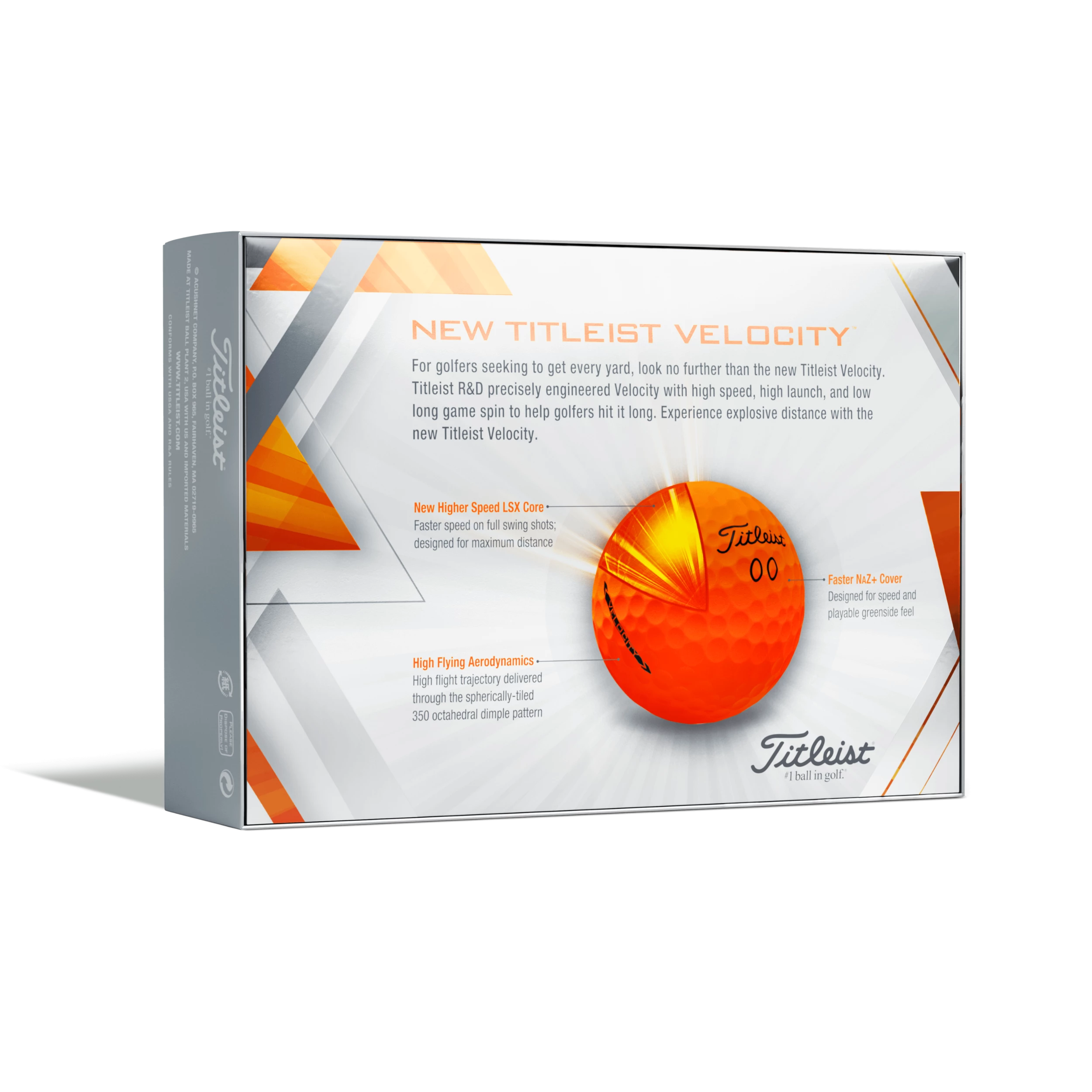 The Titleist 2022 Velocity Golf Ball has undergone a significant overhaul from its predecessor and now offers the golfer even more distance, speed and feel. The LSX core produces faster speeds on full swing shots a delivers the longest distance in the Titleist range. The new NaZ+ cover has been created to improve greenside feel, allowing the golfer to play with more touch on those crucial, delicate shots around the green that can save your score. A 350 octahedral dimple design produces a consistent a high flighted trajectory which allows golfers to maximise distance on tee shots, and stop the ball more quickly on approach shots.