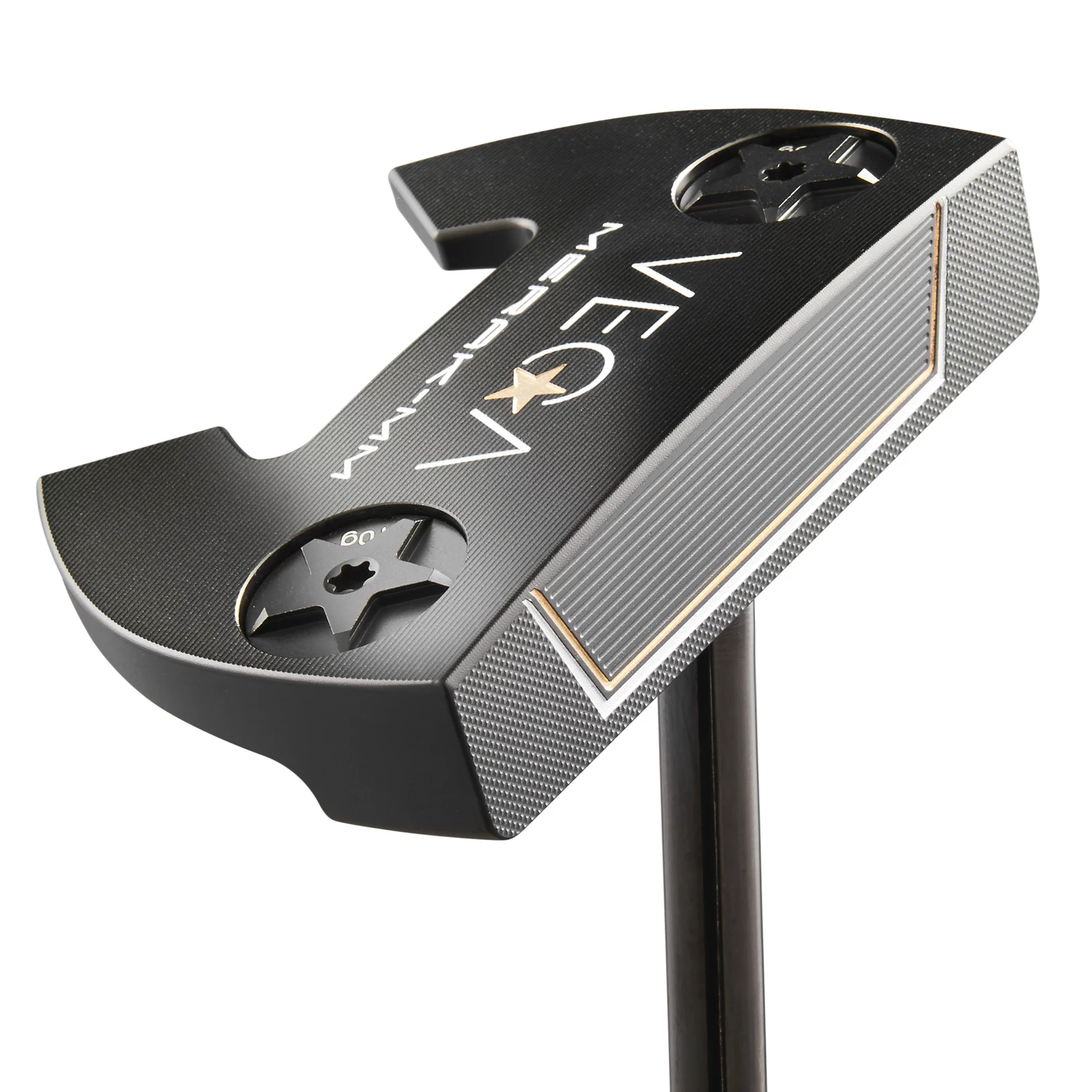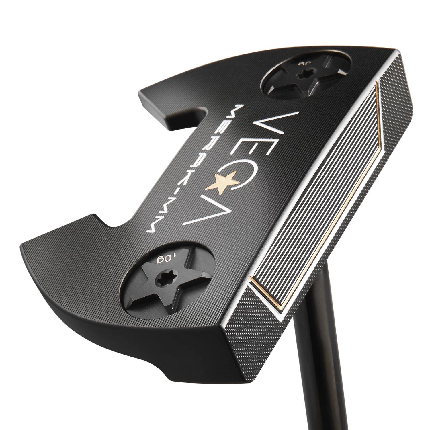 The Merak range is part of the VEGA Star line putter collection. The Meraks all feature the distinctive Star line gold and silver engraving to the face, along with VEGA’s superb black PVD finish. In our opinion, apart from the sheer quality of the designs and the aesthtic when the putter is placed behind the ball, it’s the PVD finish that sets these putters apart.